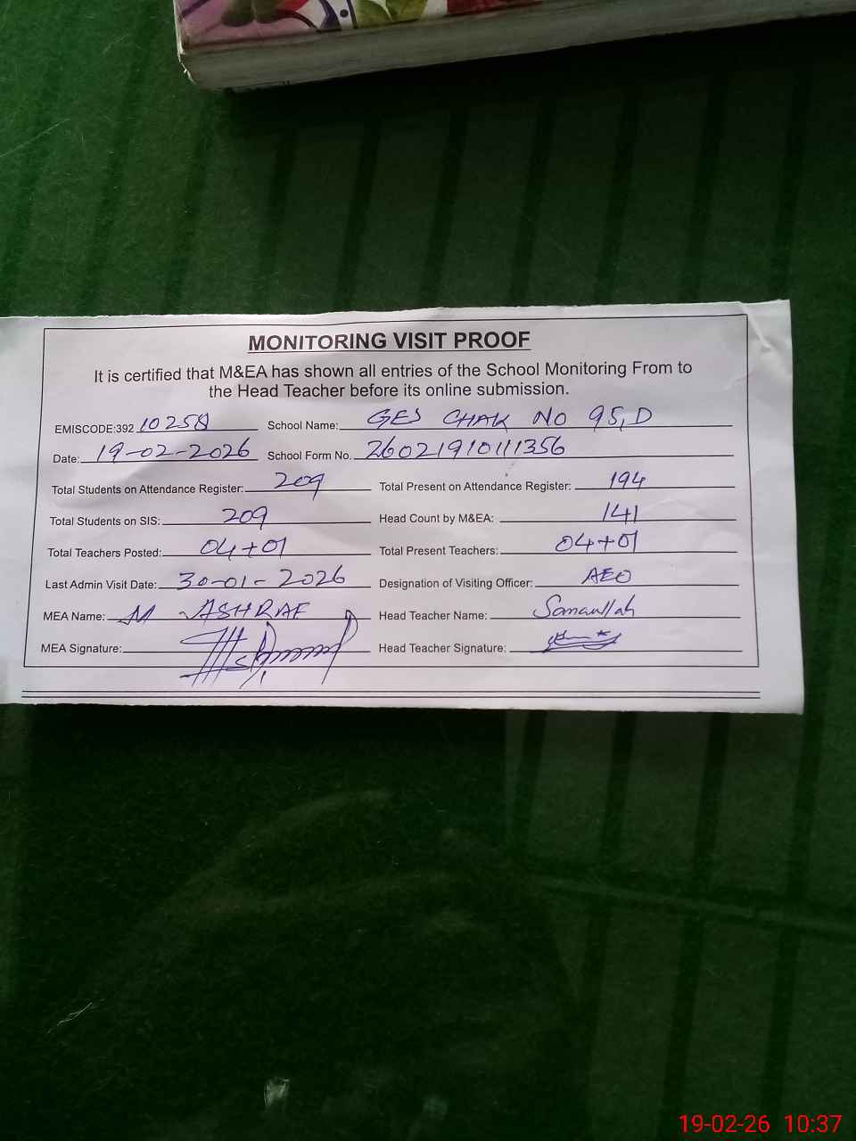 | Certified that this School was Inspected by the Undersigned MEA/DMO Today and the Information Stated Above is as Per Record. | |||||