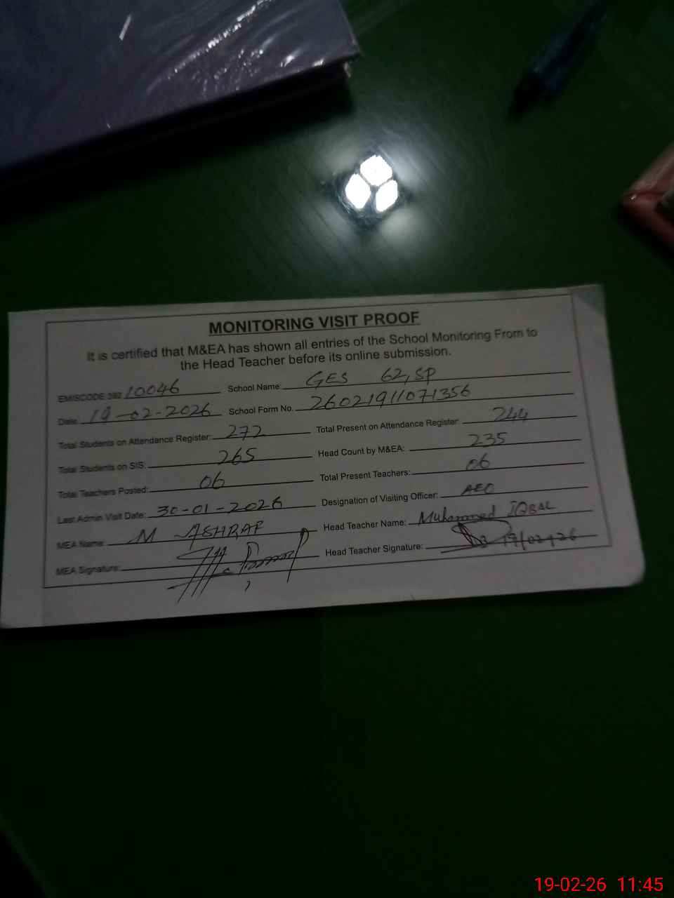 | Attendance Register | Head Teacher | MEA with School | Visit Proof |