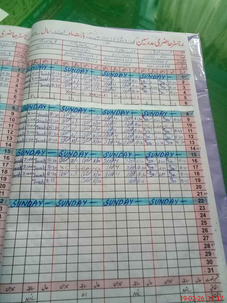 | CNIC | Full Name | Designation | R/C | Absence During Last Calender Month |