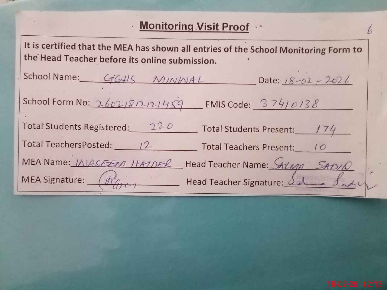 | Attendance Register | Head Teacher | MEA with School | Visit Proof |