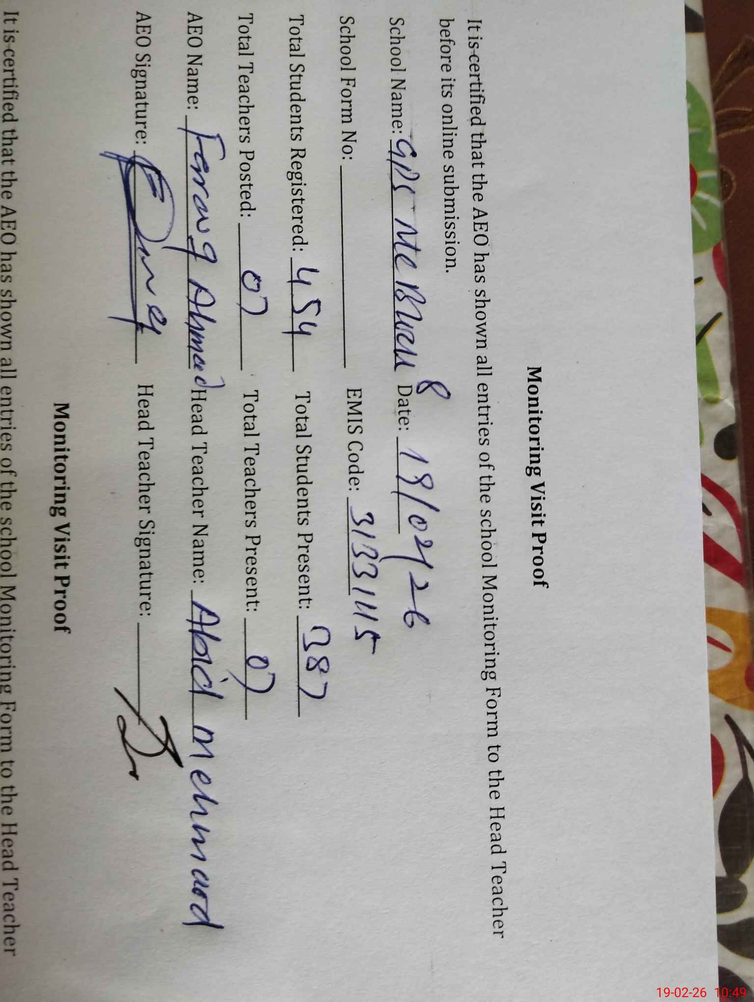 | Certified that this School was Inspected by the Undersigned MEA/DMO Today and the Information Stated Above is as Per Record. | |||||