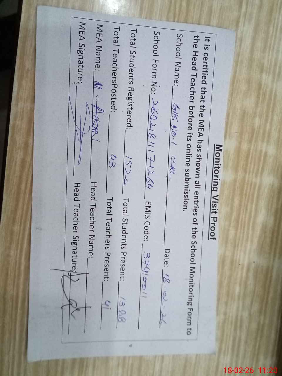 | EMIS Code: 37410011 | Name of School: GHS NO. 1 CHAKWAL | |||