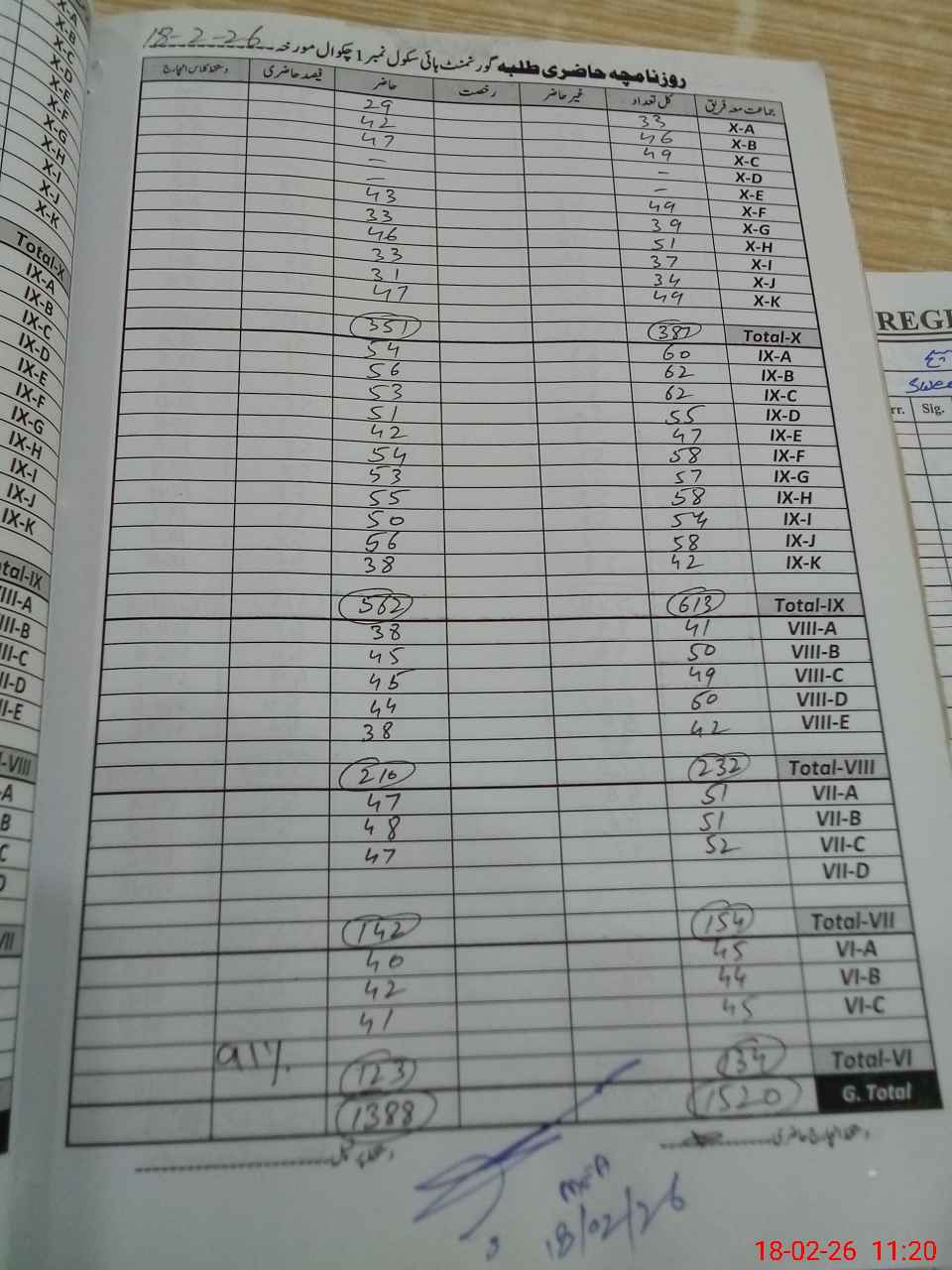 | No. of Students Present - Male | 0 | 0 | 0 | 0 | 0 | 0 | 0 | 123 | 142 | 210 | 562 | 351 | 1388 | |||