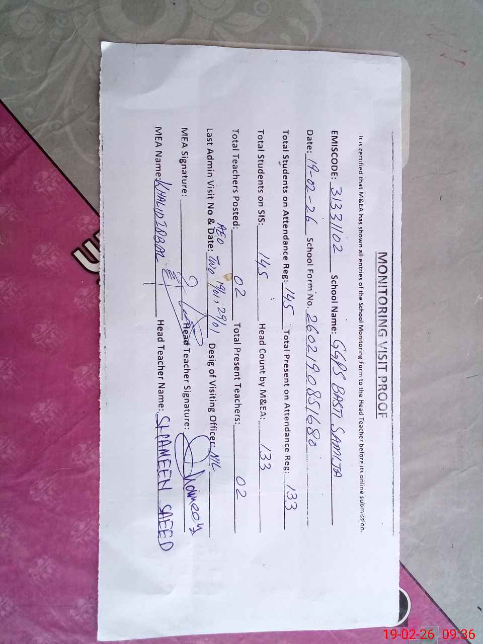 | Attendance Register | Head Teacher | MEA with School | Visit Proof |