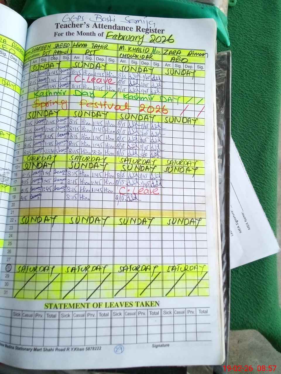 | CNIC | Full Name | Designation | R/C | Absence During Last Calender Month |