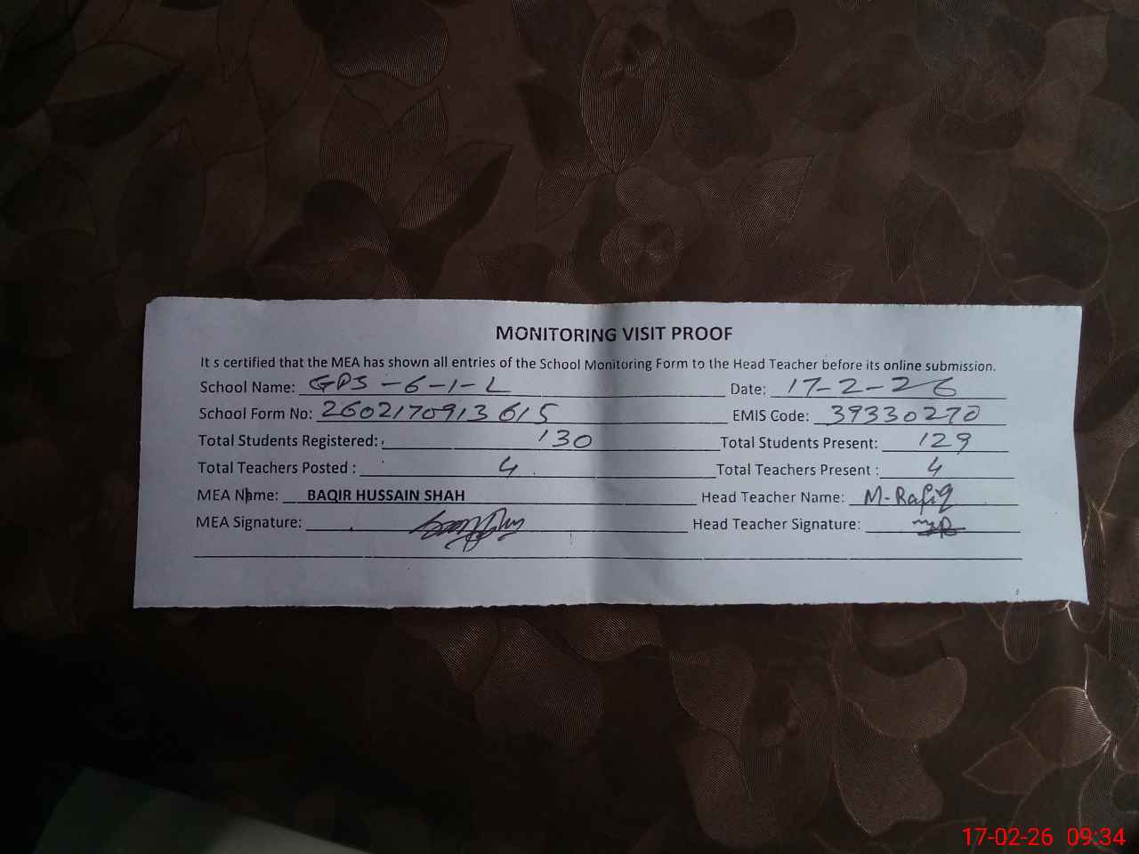| Attendance Register | Head Teacher | MEA with School | Visit Proof |