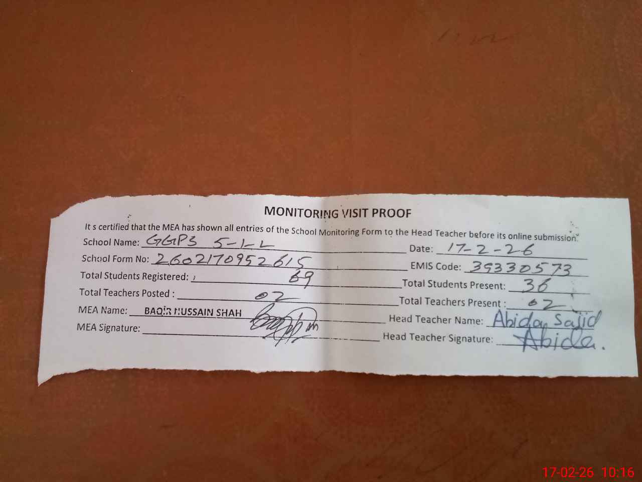 | Certified that this School was Inspected by the Undersigned MEA/DMO Today and the Information Stated Above is as Per Record. | |||||