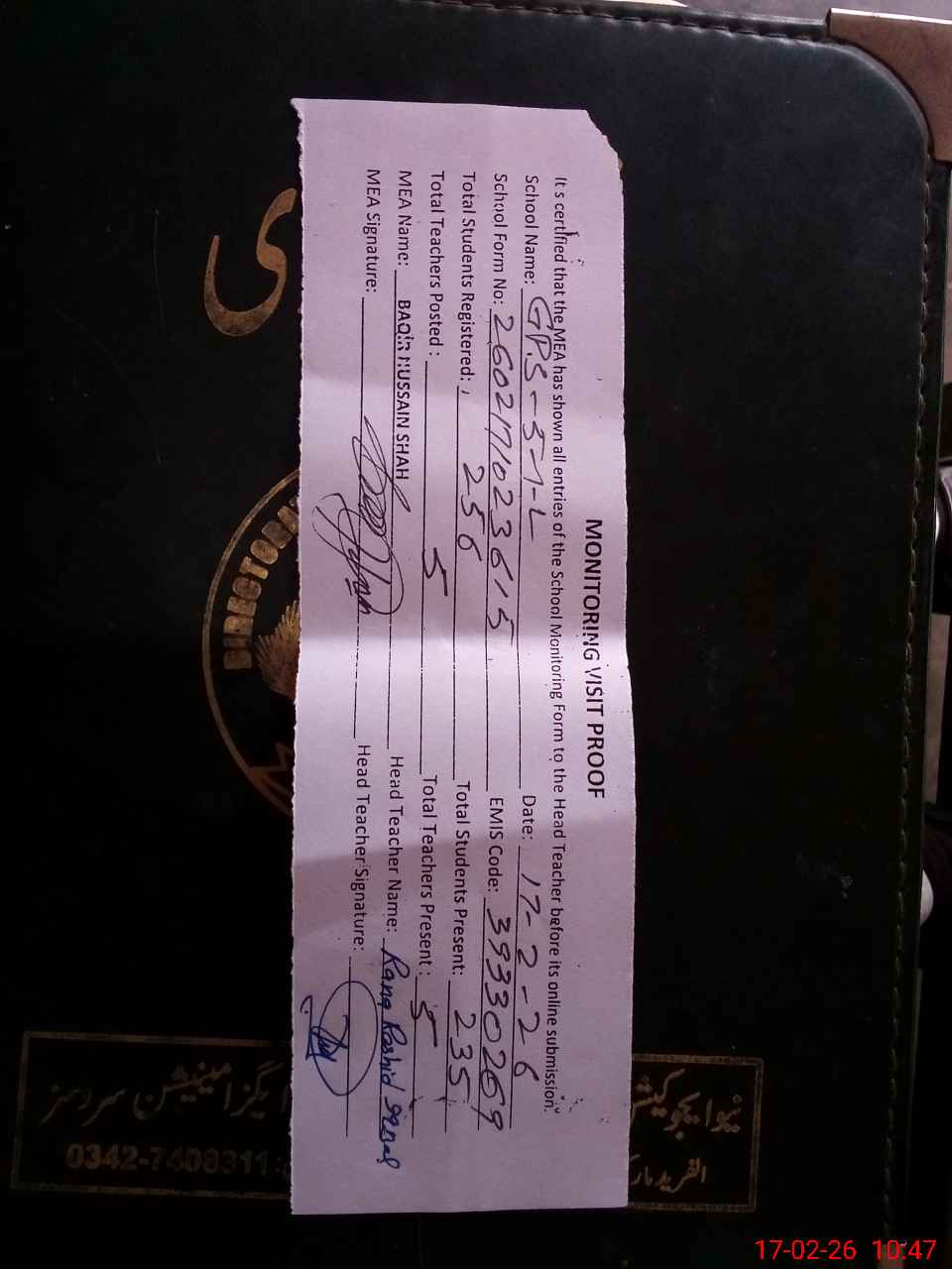 | Certified that this School was Inspected by the Undersigned MEA/DMO Today and the Information Stated Above is as Per Record. | |||||