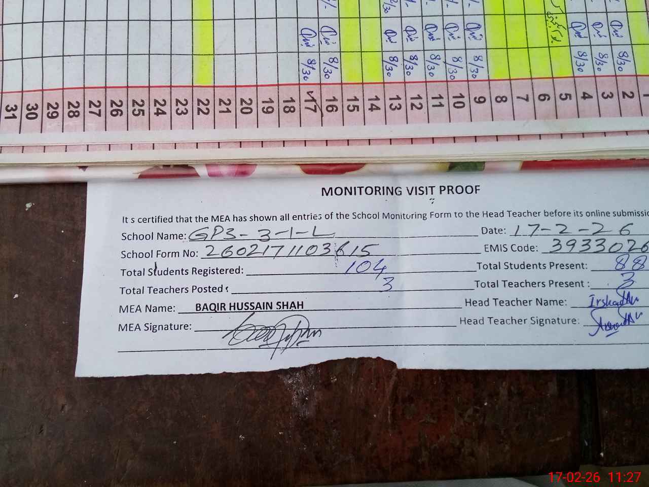 | Attendance Register | Head Teacher | MEA with School | Visit Proof |