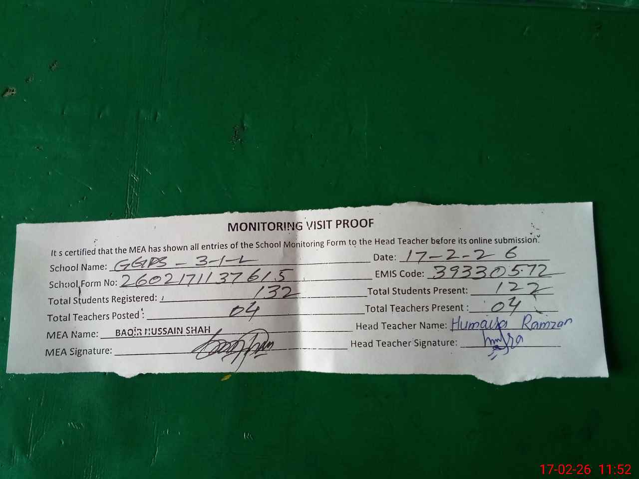 | Attendance Register | Head Teacher | MEA with School | Visit Proof |