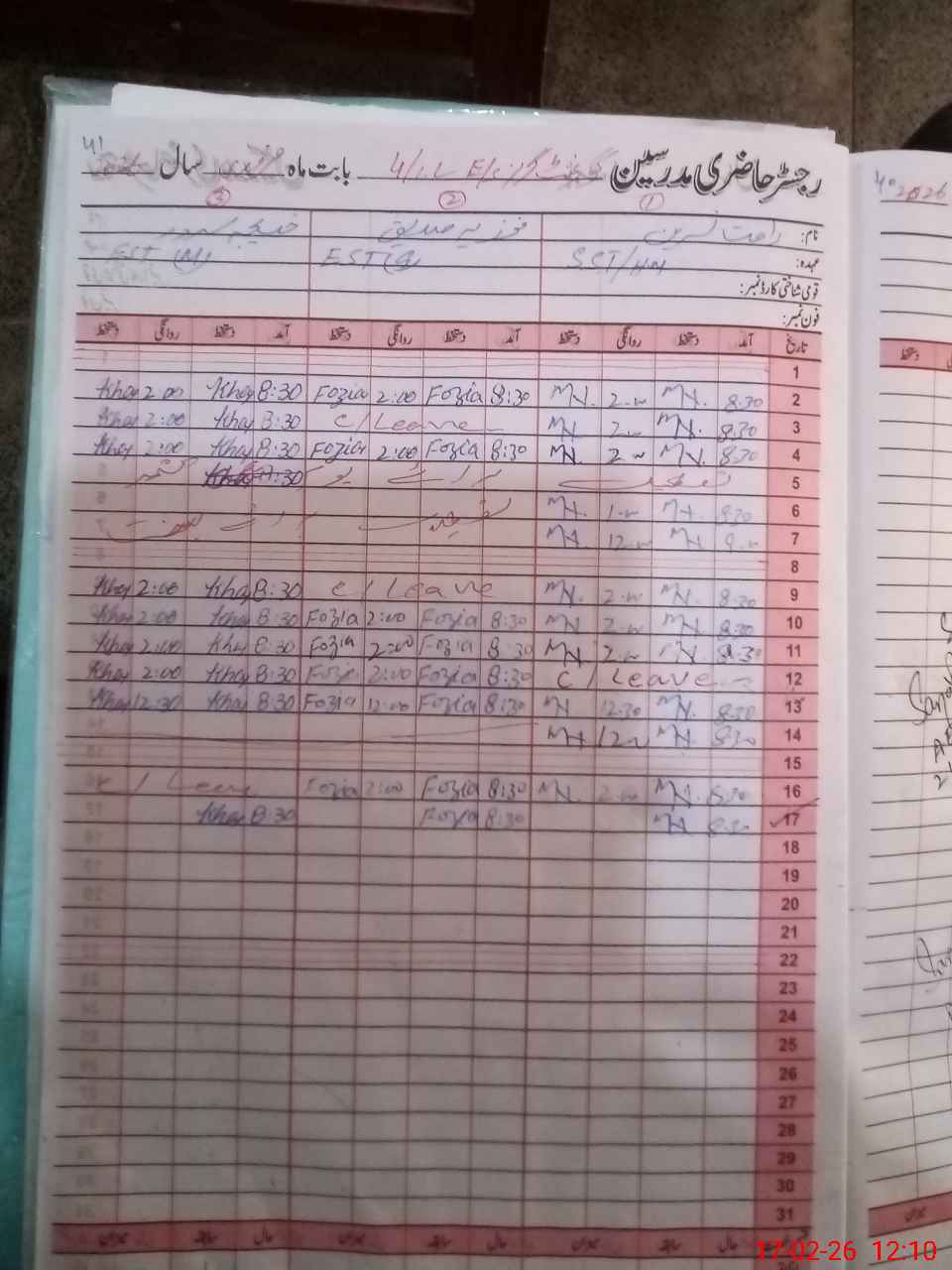 | 35**** | Ay**** Kh**** | PST Science/Maths | Regular | 0 | 0 | 0 | 0 | 0 | 0 | 0 | 0 | 0 | Casual |