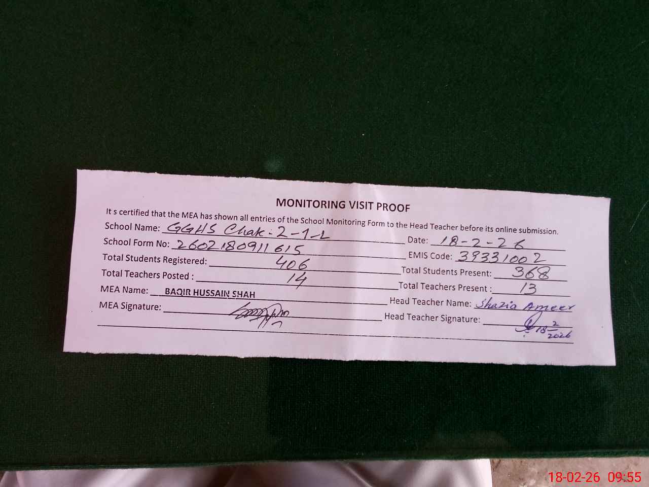 | Attendance Register | Head Teacher | MEA with School | Visit Proof |