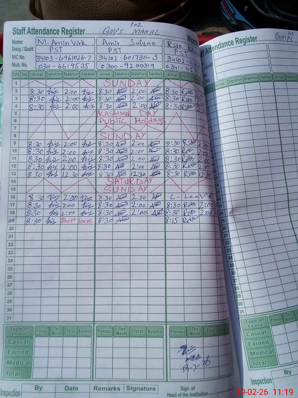 | CNIC | Full Name | Designation | R/C | Absence During Last Calender Month |