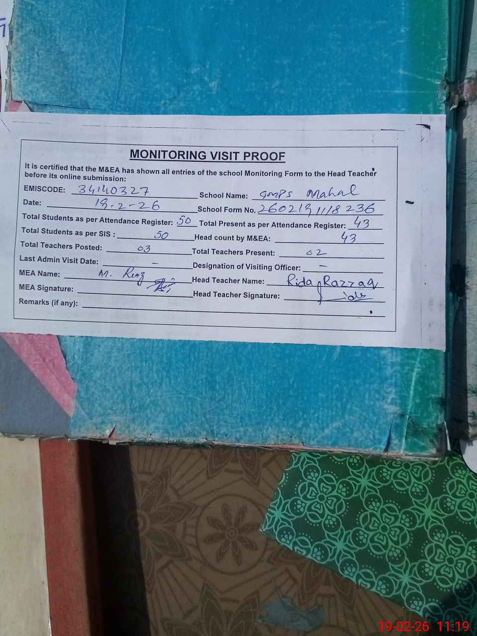 | Attendance Register | Head Teacher | MEA with School | Visit Proof |