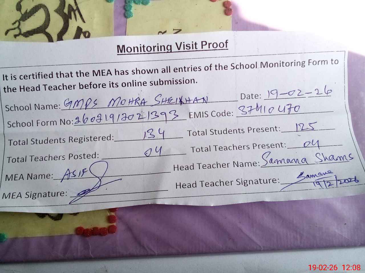 | EMIS Code: 37410470 | Name of School: GMPS MOHRA SHEIKHAN | |||