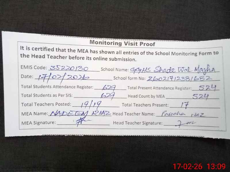 | EMIS Code: 35220130 | Name of School: GGHS SHADA WAL MAJA | |||