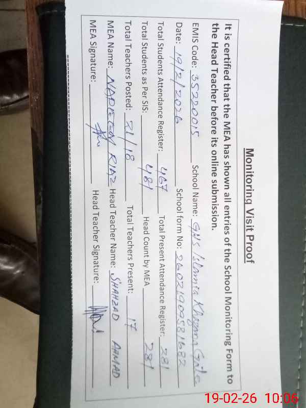 | EMIS Code: 35220015 | Name of School: GHS ISLAMIA KHAZANA GATE LOWER MALL | |||