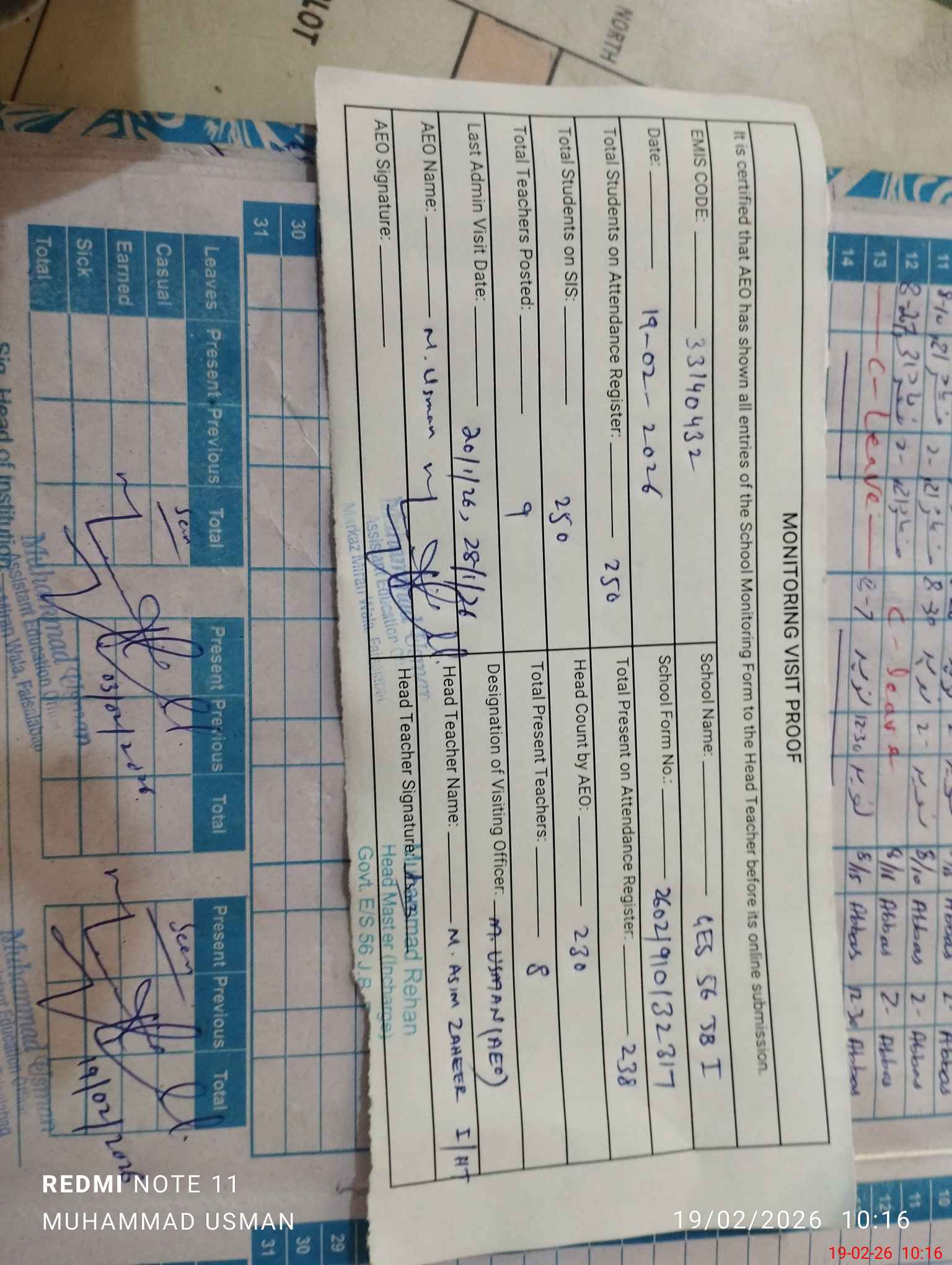 | Certified that this School was Inspected by the Undersigned MEA/DMO Today and the Information Stated Above is as Per Record. | |||||