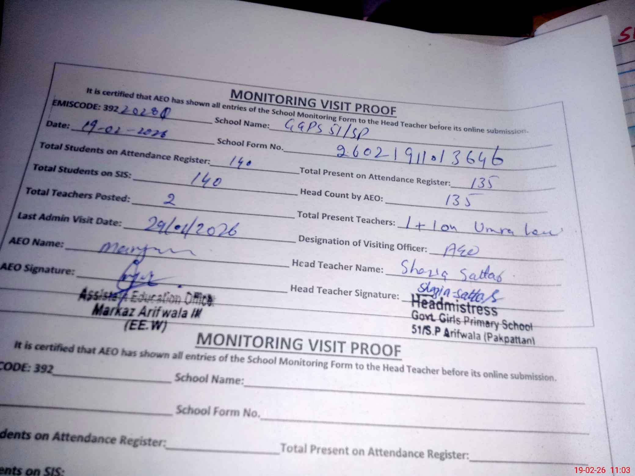 | Attendance Register | Head Teacher | MEA with School | Visit Proof |