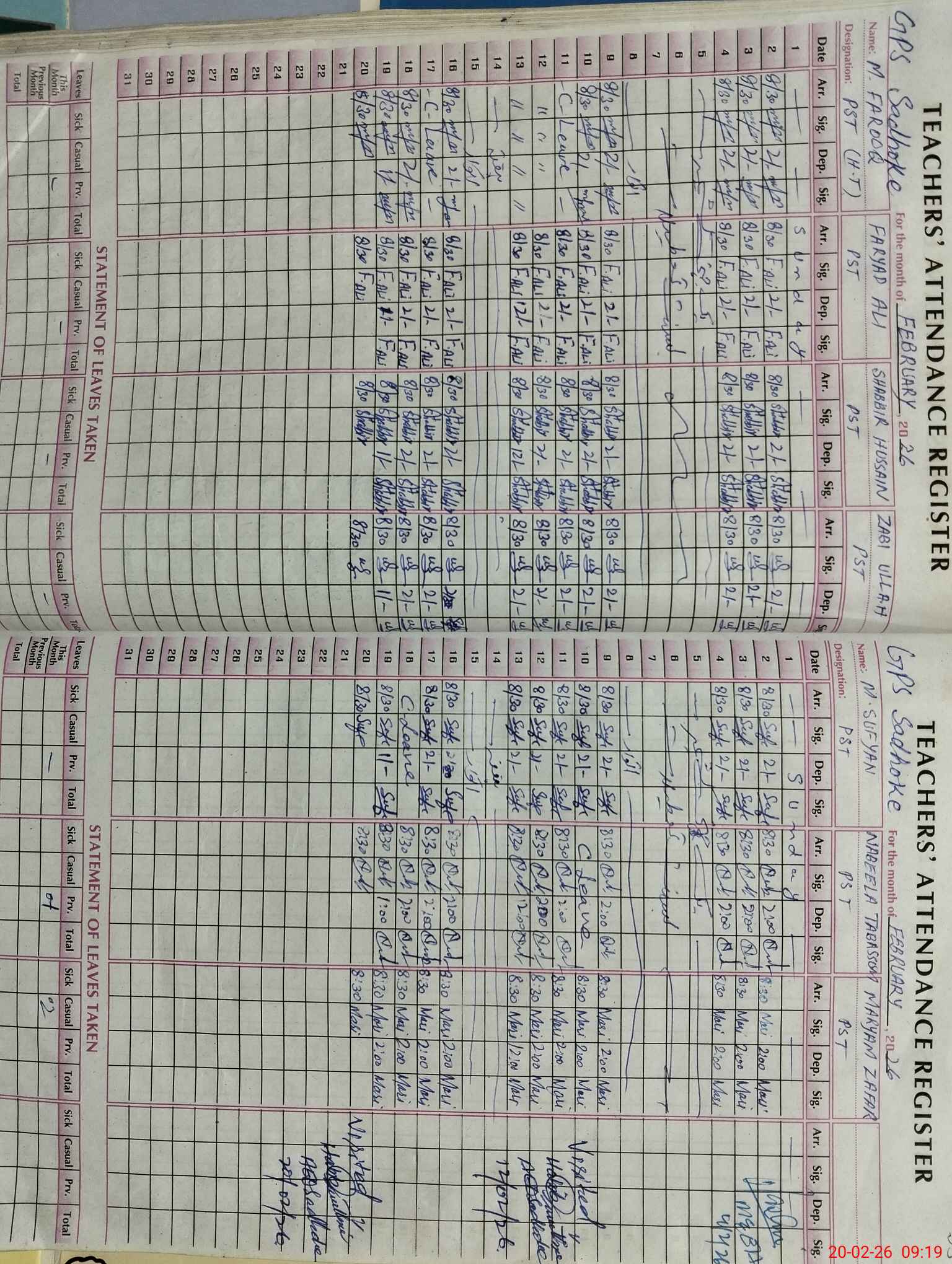 | CNIC | Full Name | Designation | R/C | Absence During Last Calender Month |