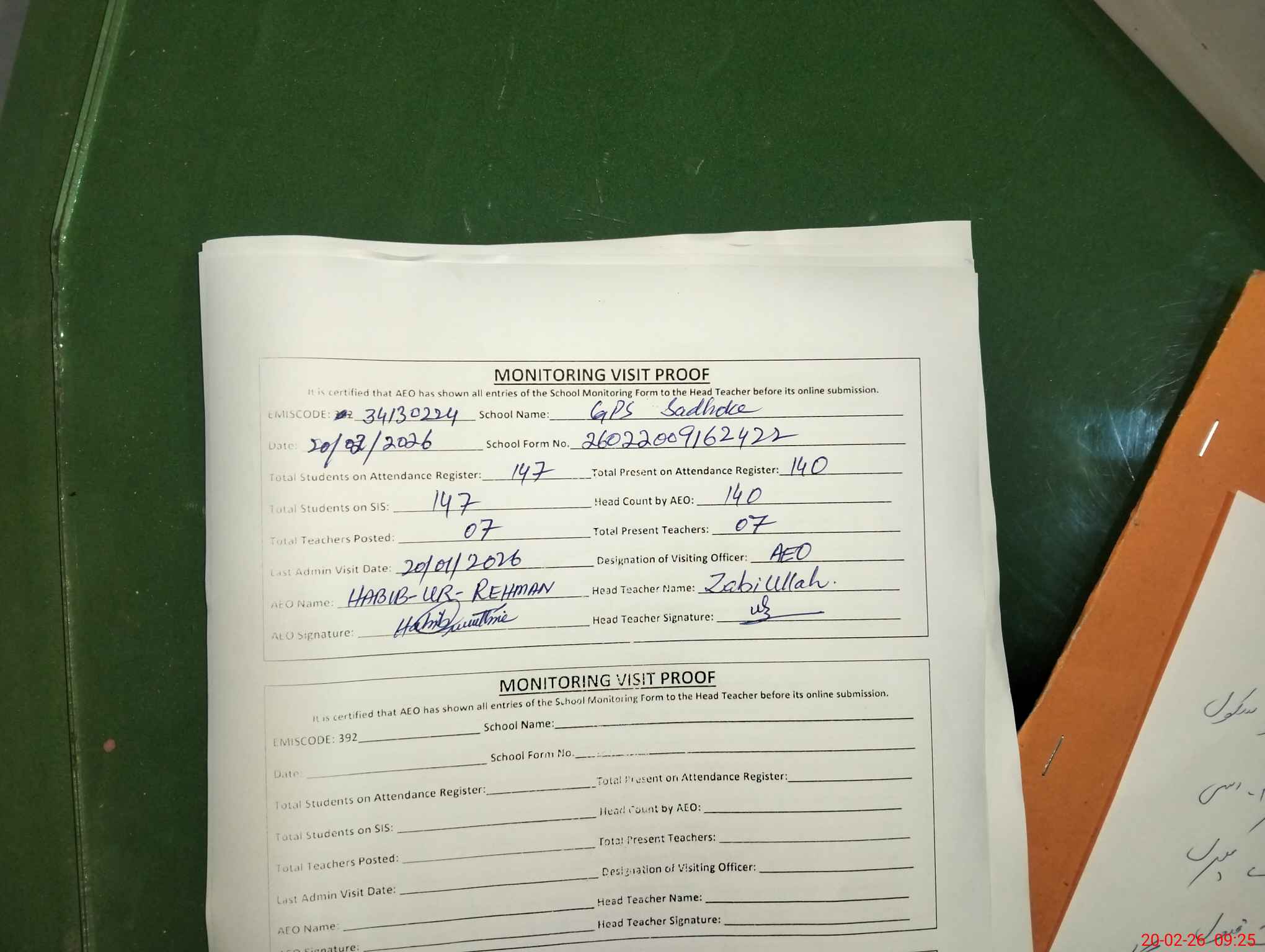 | Attendance Register | Head Teacher | MEA with School | Visit Proof |