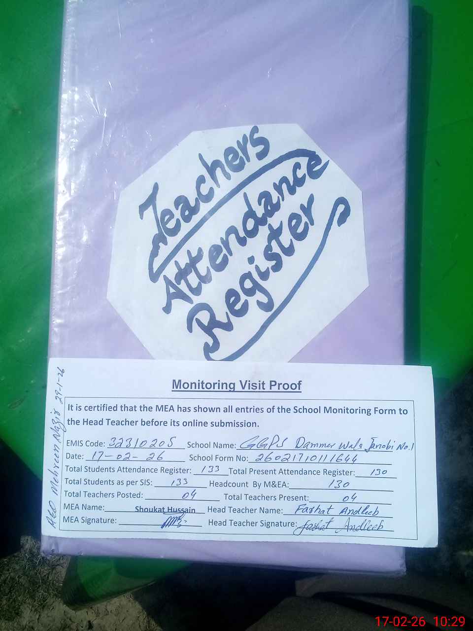 | Attendance Register | Head Teacher | MEA with School | Visit Proof |