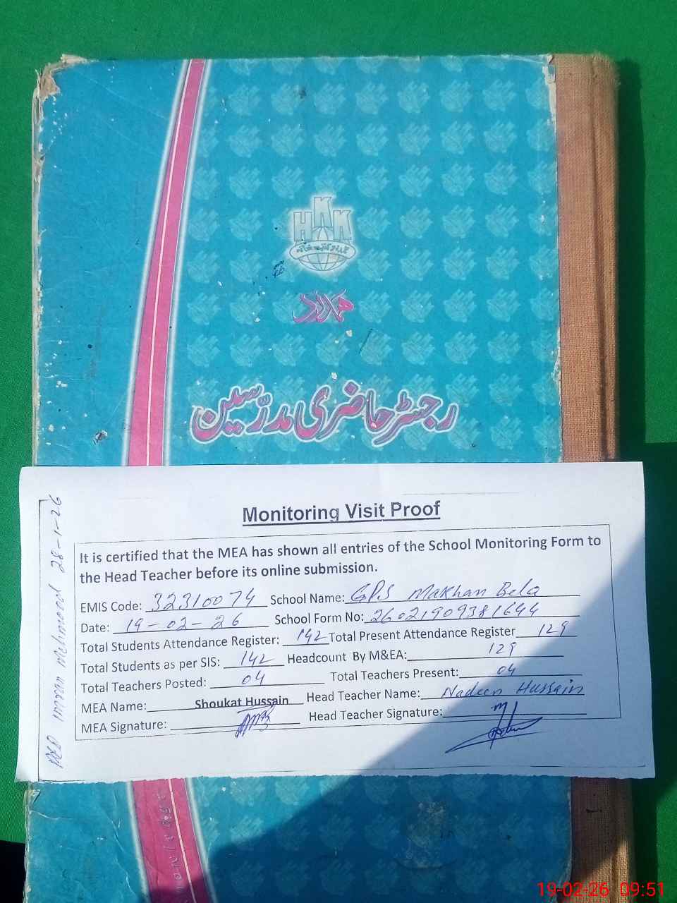 | Attendance Register | Head Teacher | MEA with School | Visit Proof |