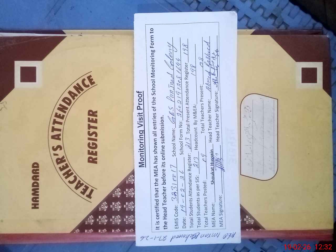 | Attendance Register | Head Teacher | MEA with School | Visit Proof |