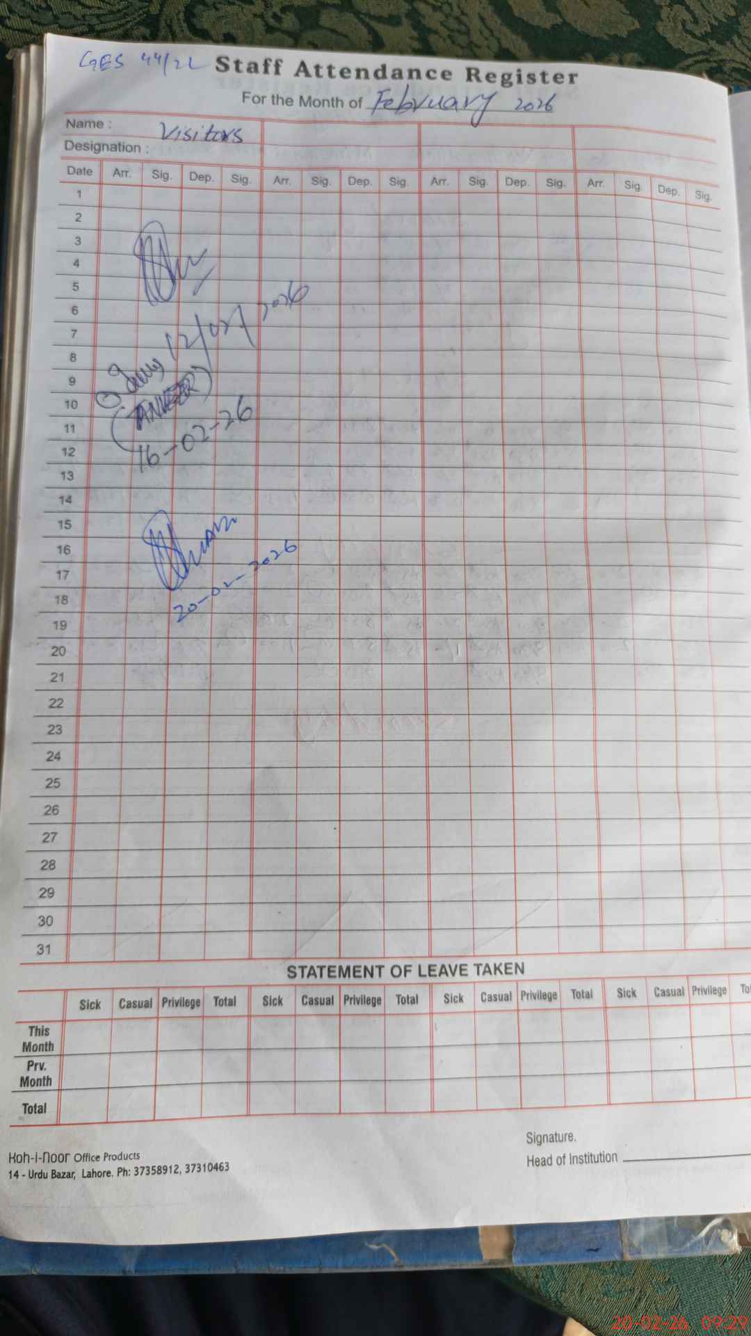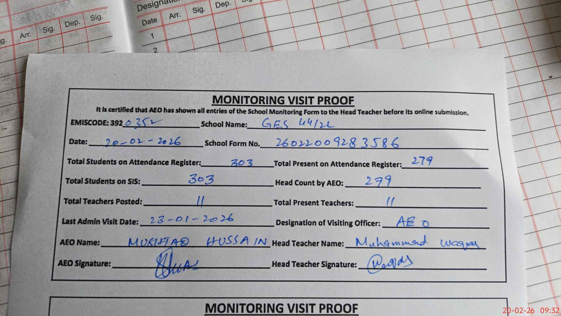 | Attendance Register | Head Teacher | MEA with School | Visit Proof |