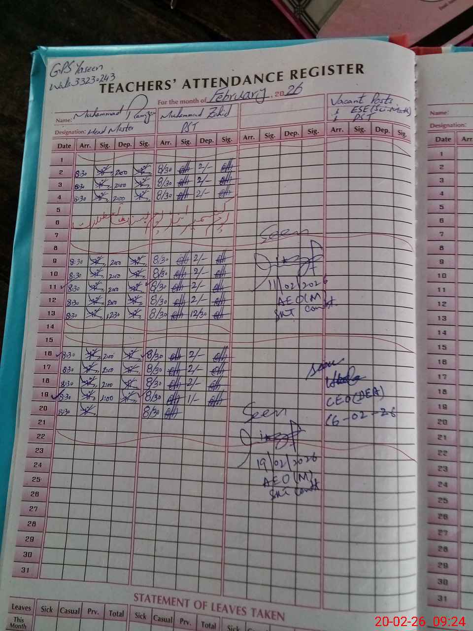 | Name: MU**** RA**** Designation: (School Headmaster's/Headmistress's) PST Phone/Cell Number: 03**** |