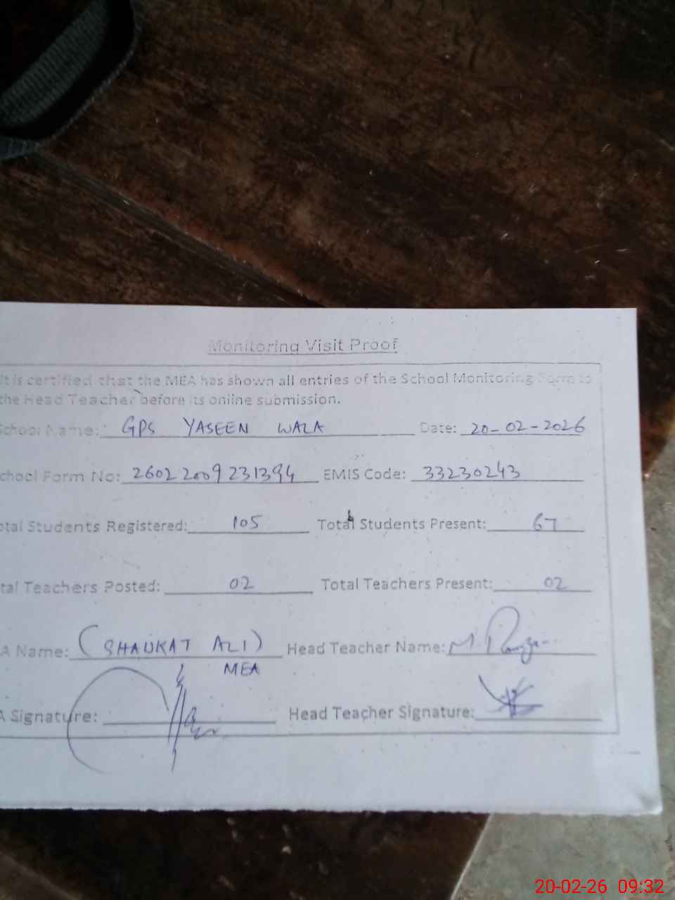 | Attendance Register | Head Teacher | MEA with School | Visit Proof |