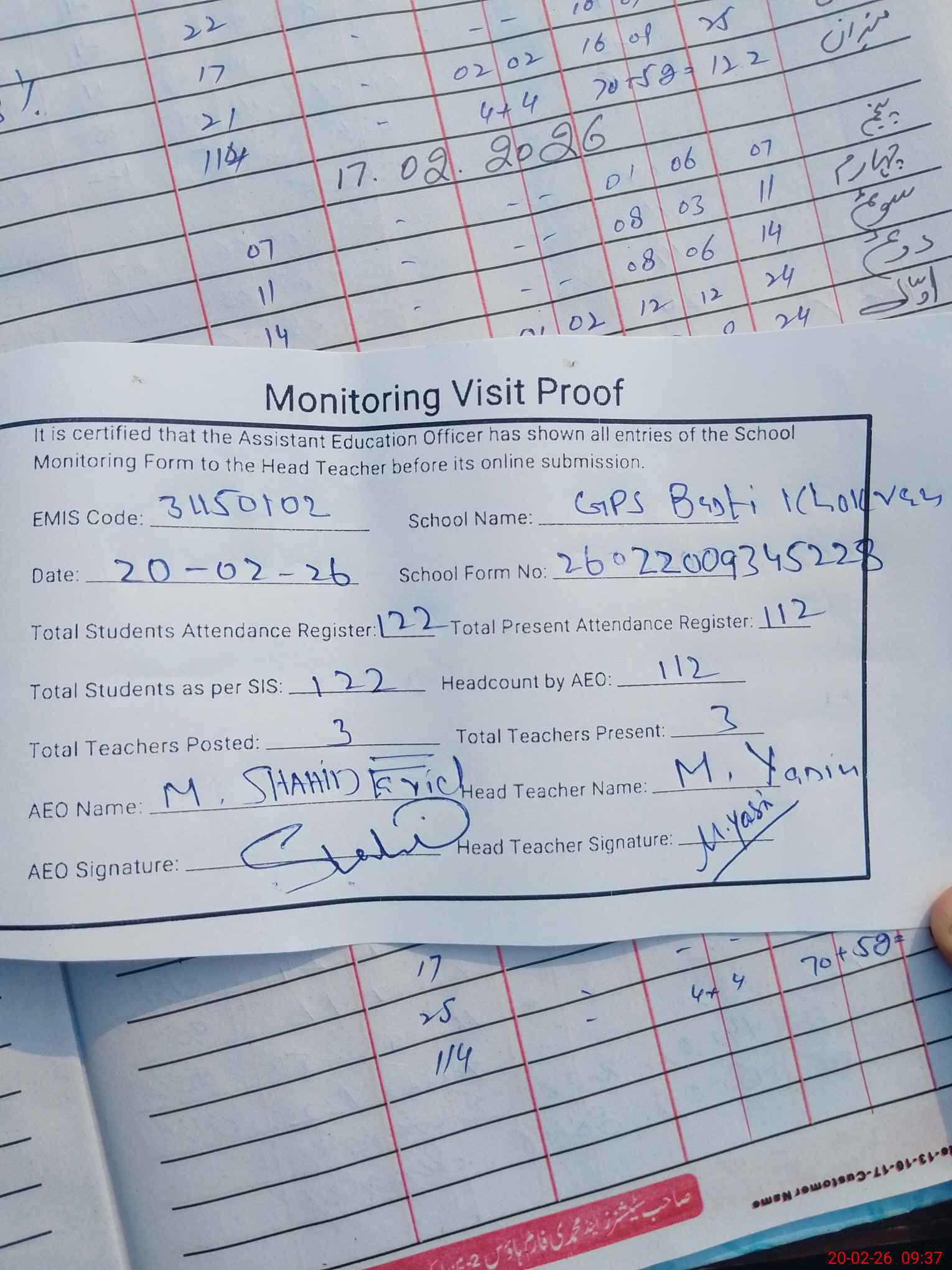 | Attendance Register | Head Teacher | MEA with School | Visit Proof |