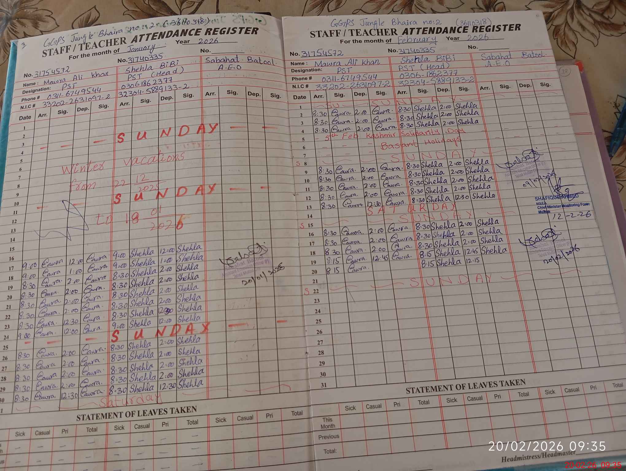 | Attendance Register | Head Teacher | MEA with School | Visit Proof |