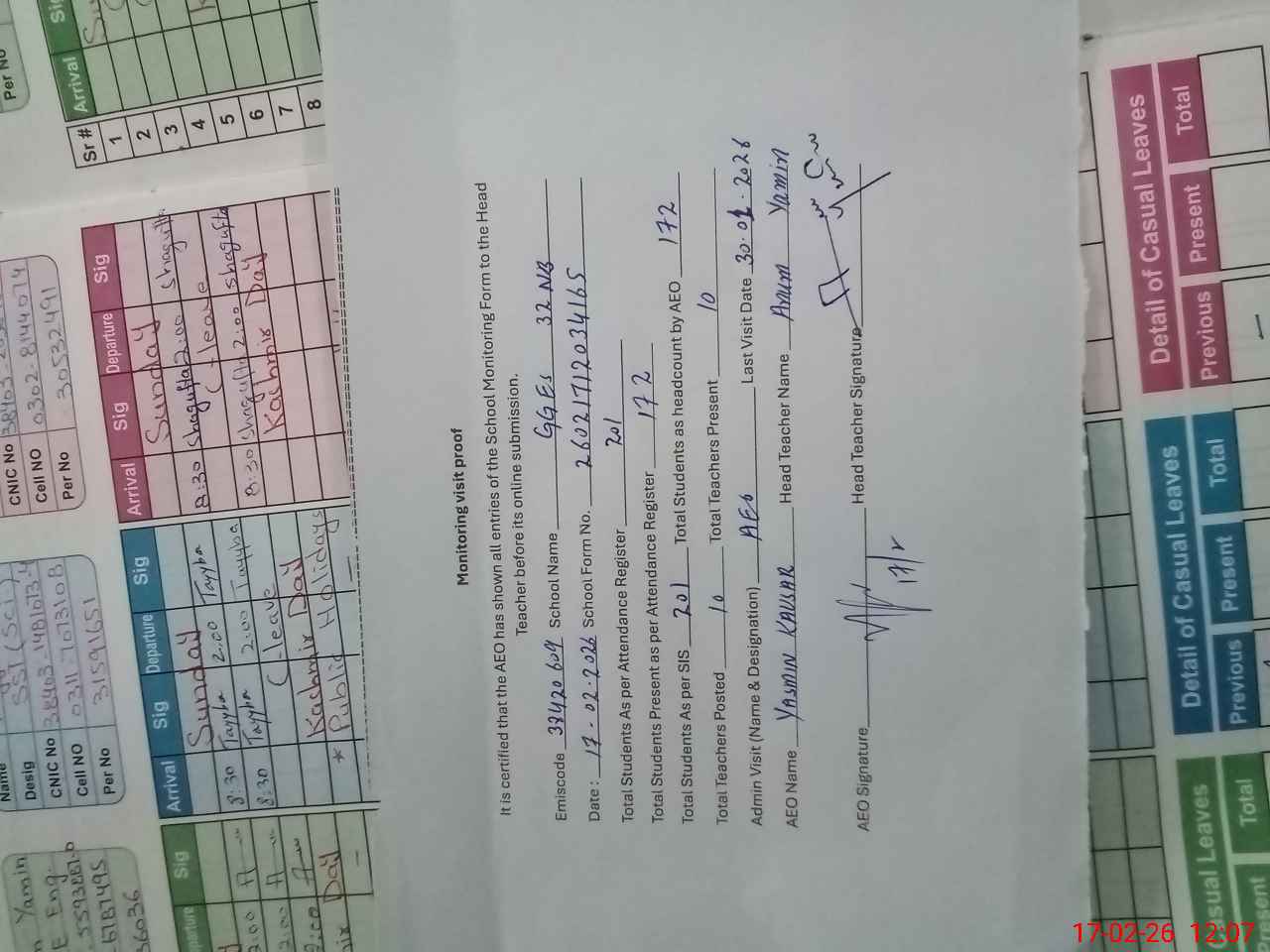 | Attendance Register | Head Teacher | MEA with School | Visit Proof |