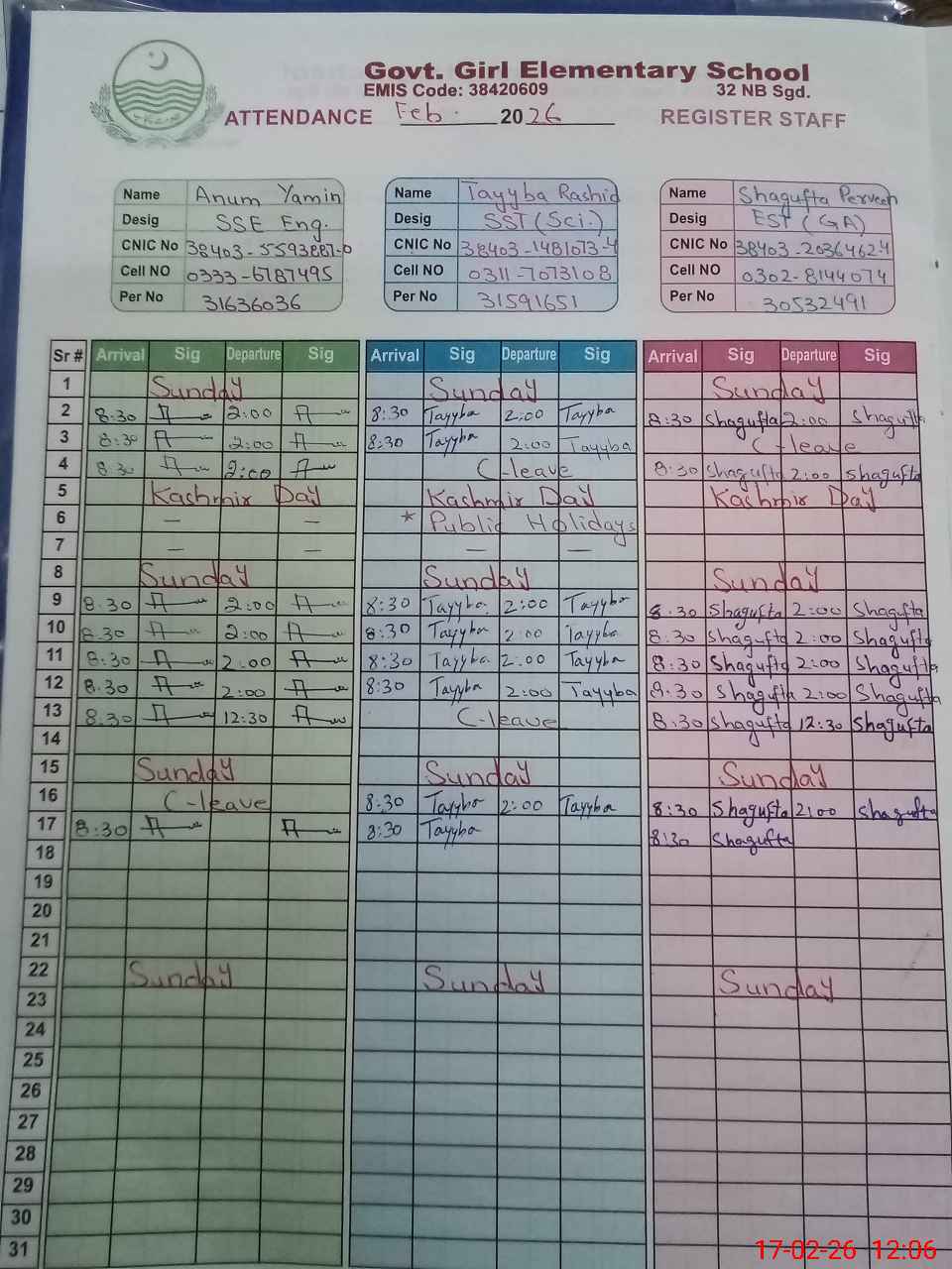 | CNIC | Full Name | Designation | R/C | Absence During Last Calender Month |