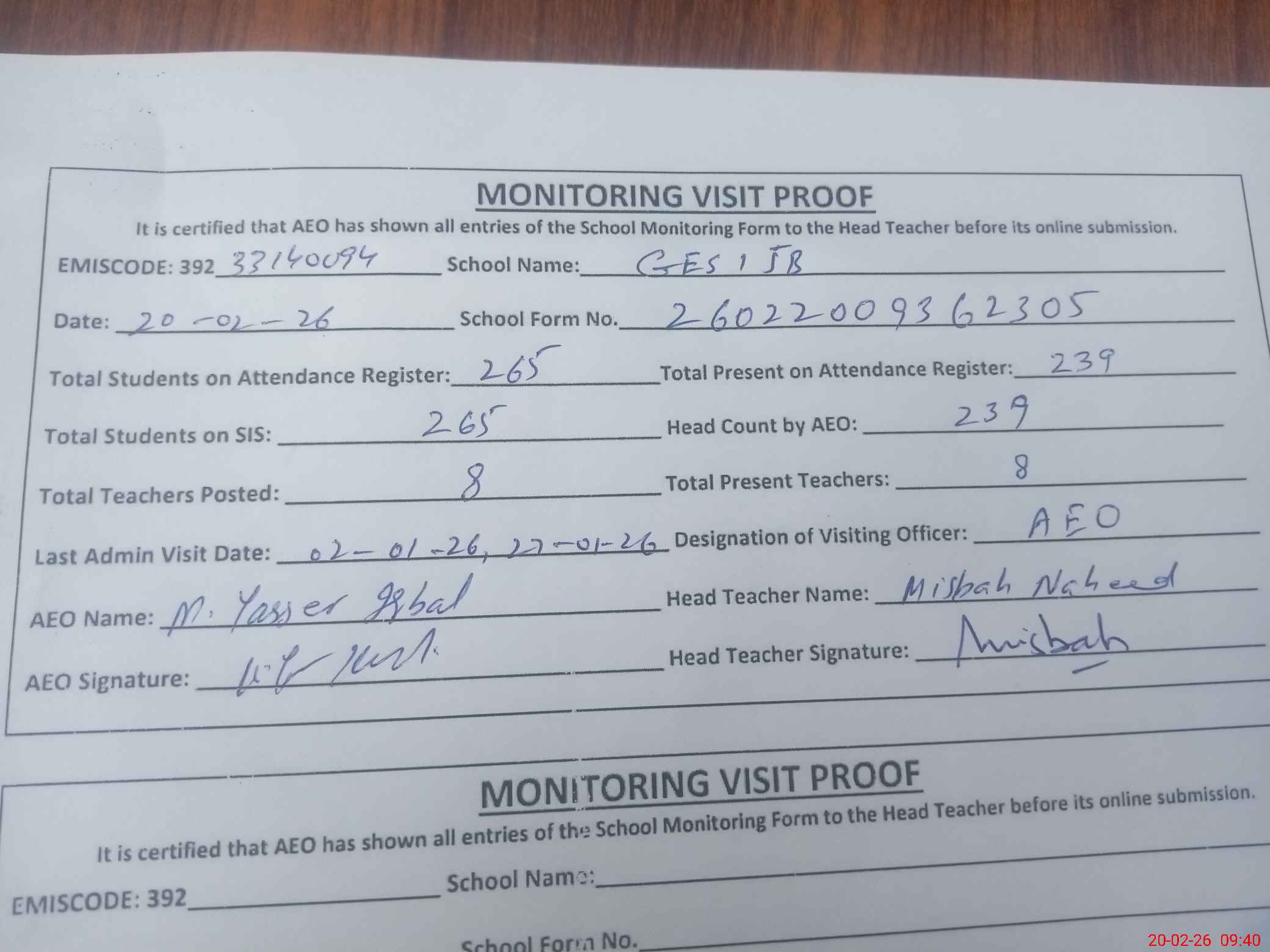 | Monitoring Date: 20-02-2026 | Start Time: 20-02-2026 09:13 AM | End Time: 20-02-2026 09:40 AM | Name of MEA: M.Ya**** Iq**** | |