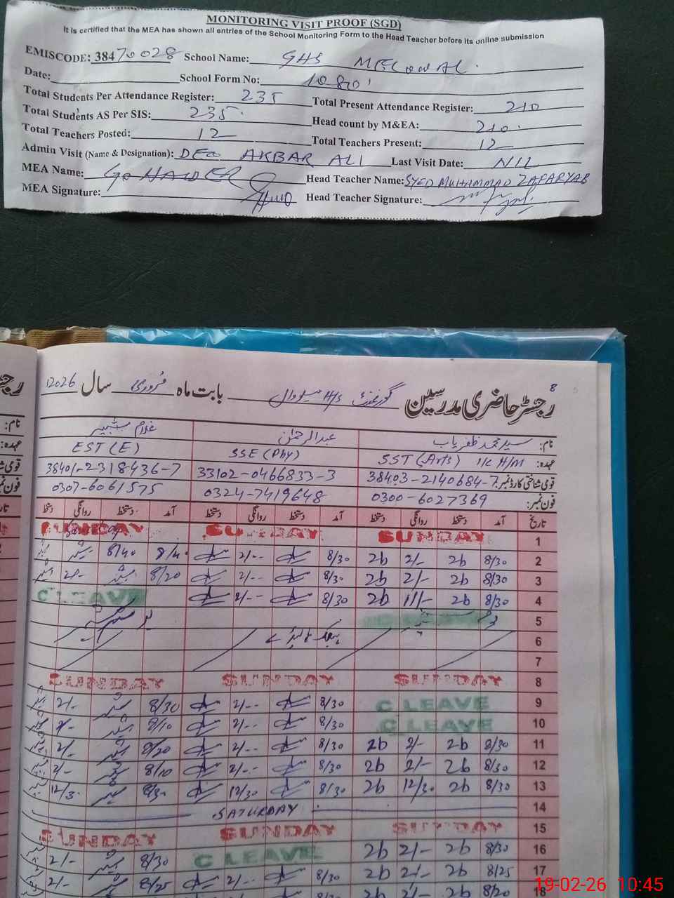 | Attendance Register | Head Teacher | MEA with School | Visit Proof |