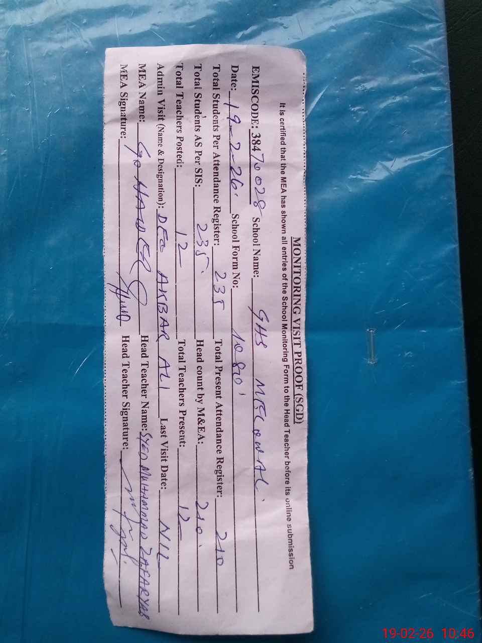 | Certified that this School was Inspected by the Undersigned MEA/DMO Today and the Information Stated Above is as Per Record. | |||||