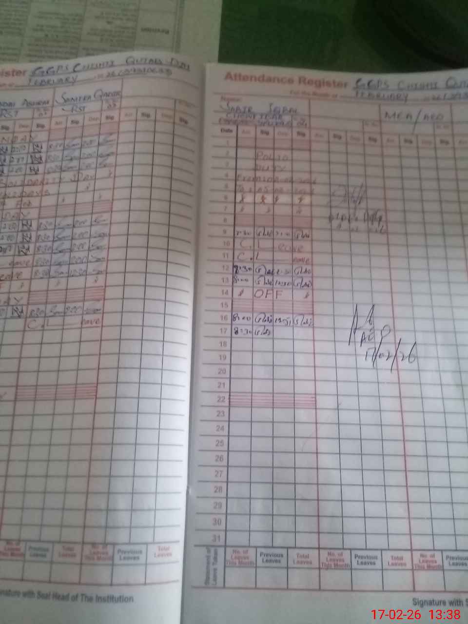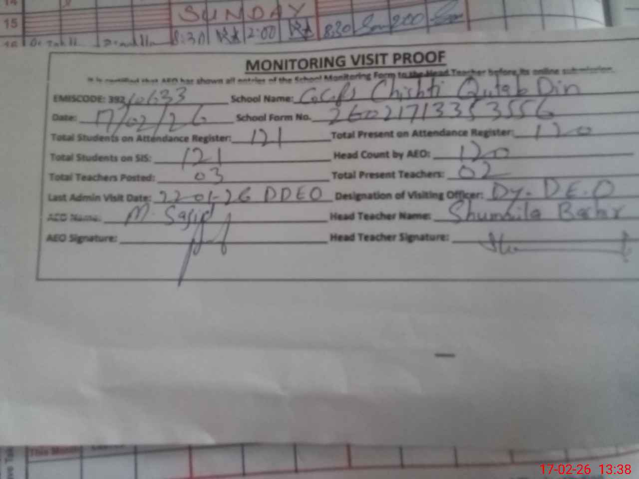 | Attendance Register | Head Teacher | MEA with School | Visit Proof |