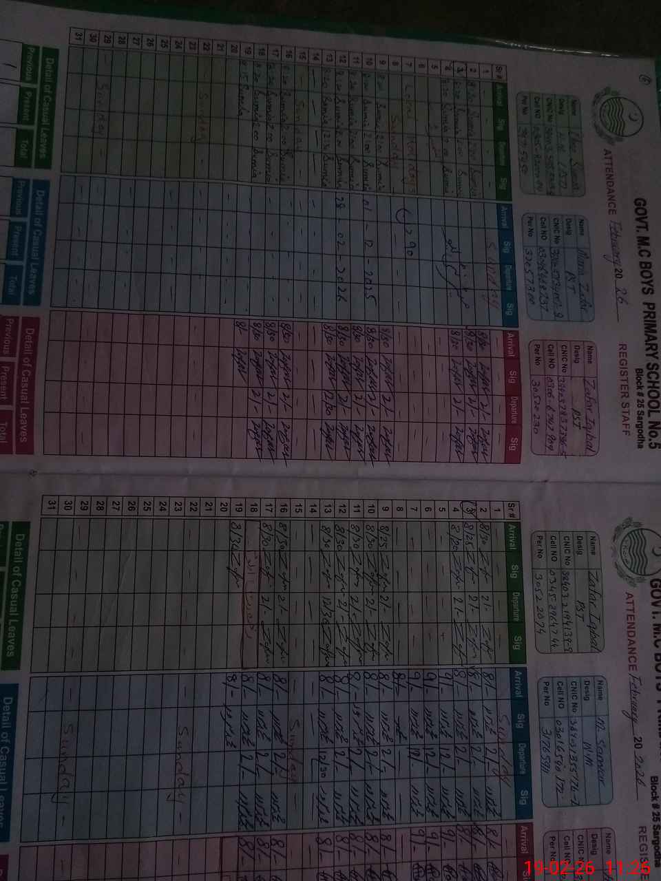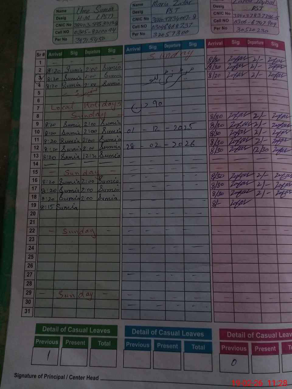 | CNIC | Full Name | Designation | R/C | Absence during last cal. month |