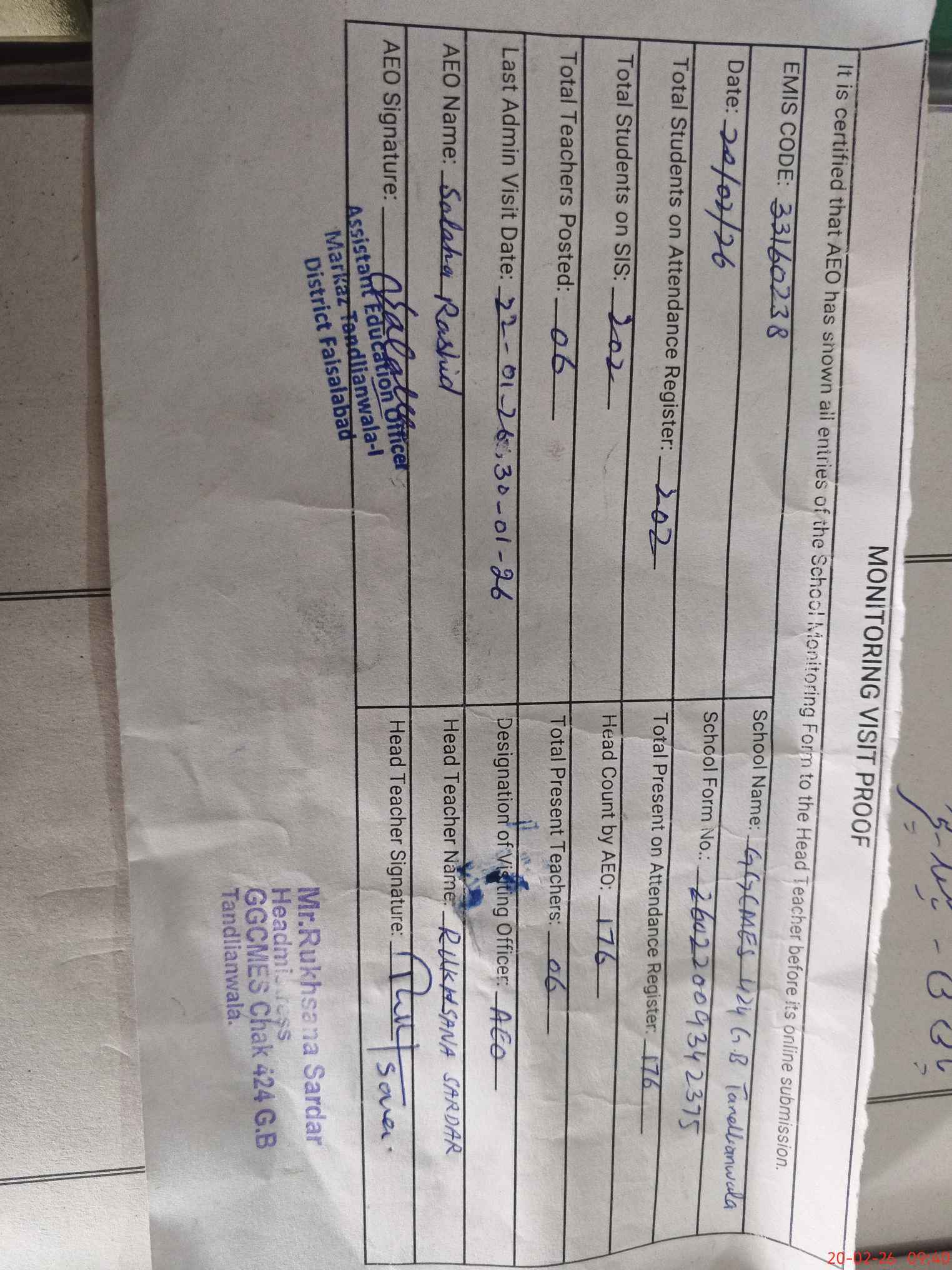 | EMIS Code: 33160238 | Name of School: GGCMES CHAK 424 GB TANDLIANWALA | |||