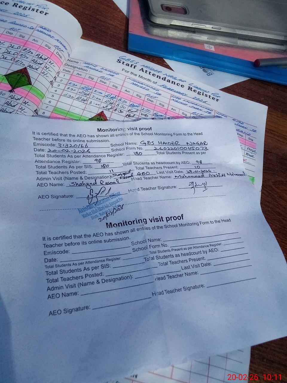 | Attendance Register | Head Teacher | MEA with School | Visit Proof |