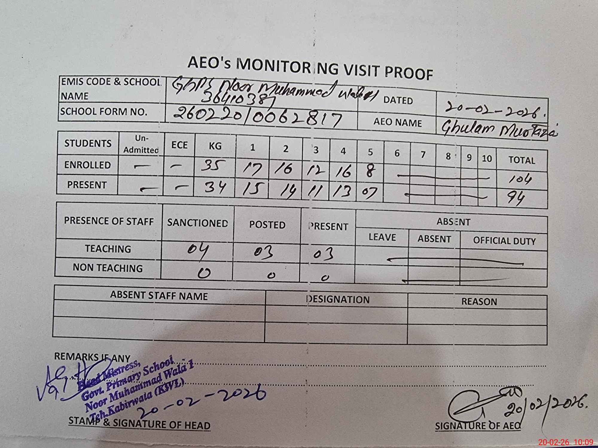 | Attendance Register | Head Teacher | MEA with School | Visit Proof |