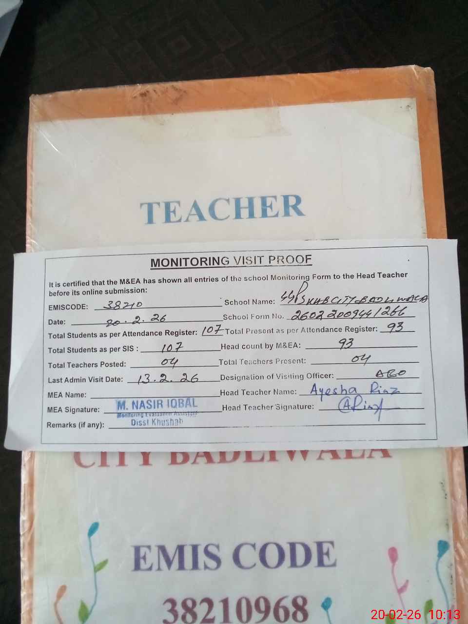 | Attendance Register | Head Teacher | MEA with School | Visit Proof |