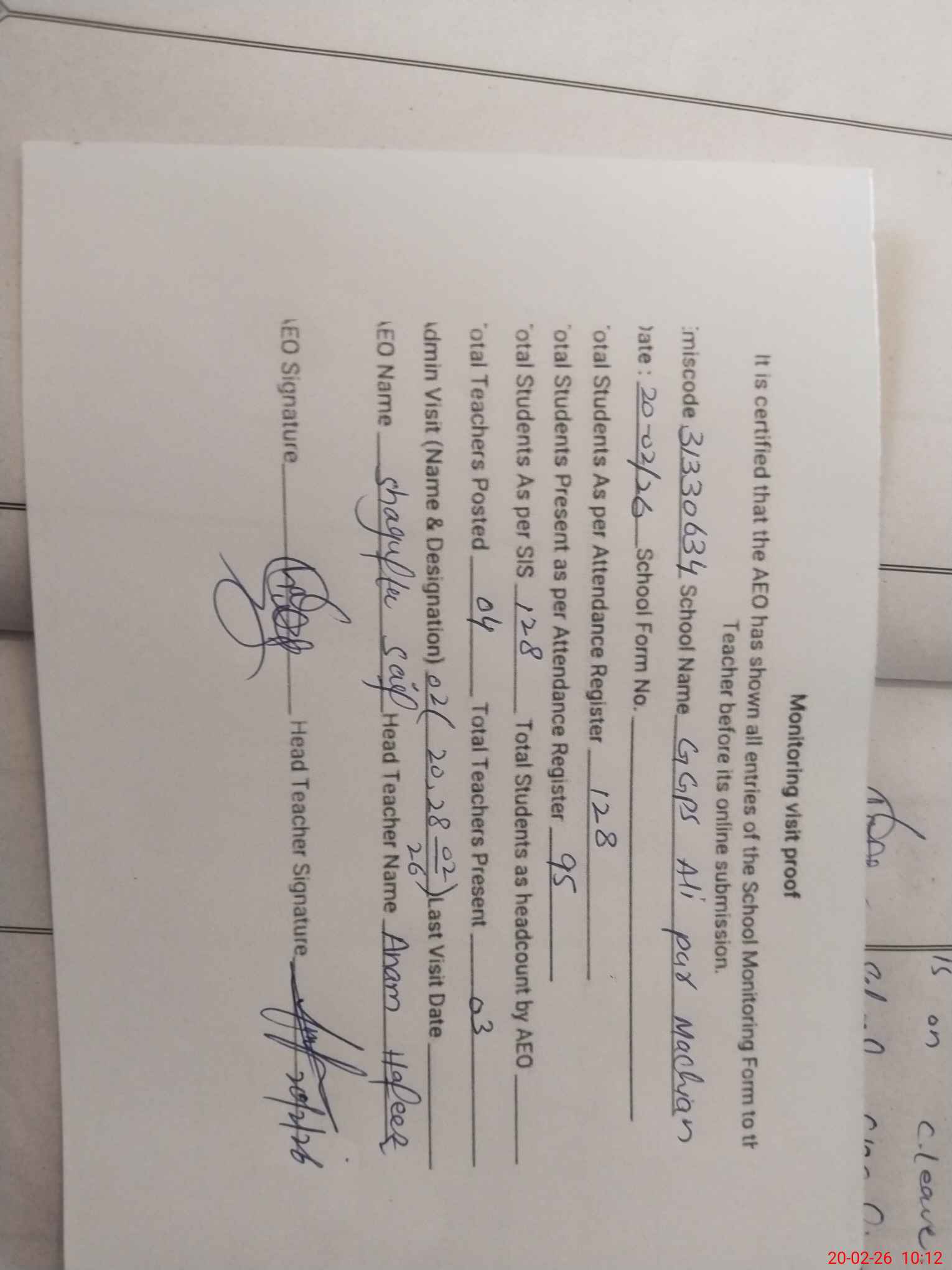 | Attendance Register | Head Teacher | MEA with School | Visit Proof |