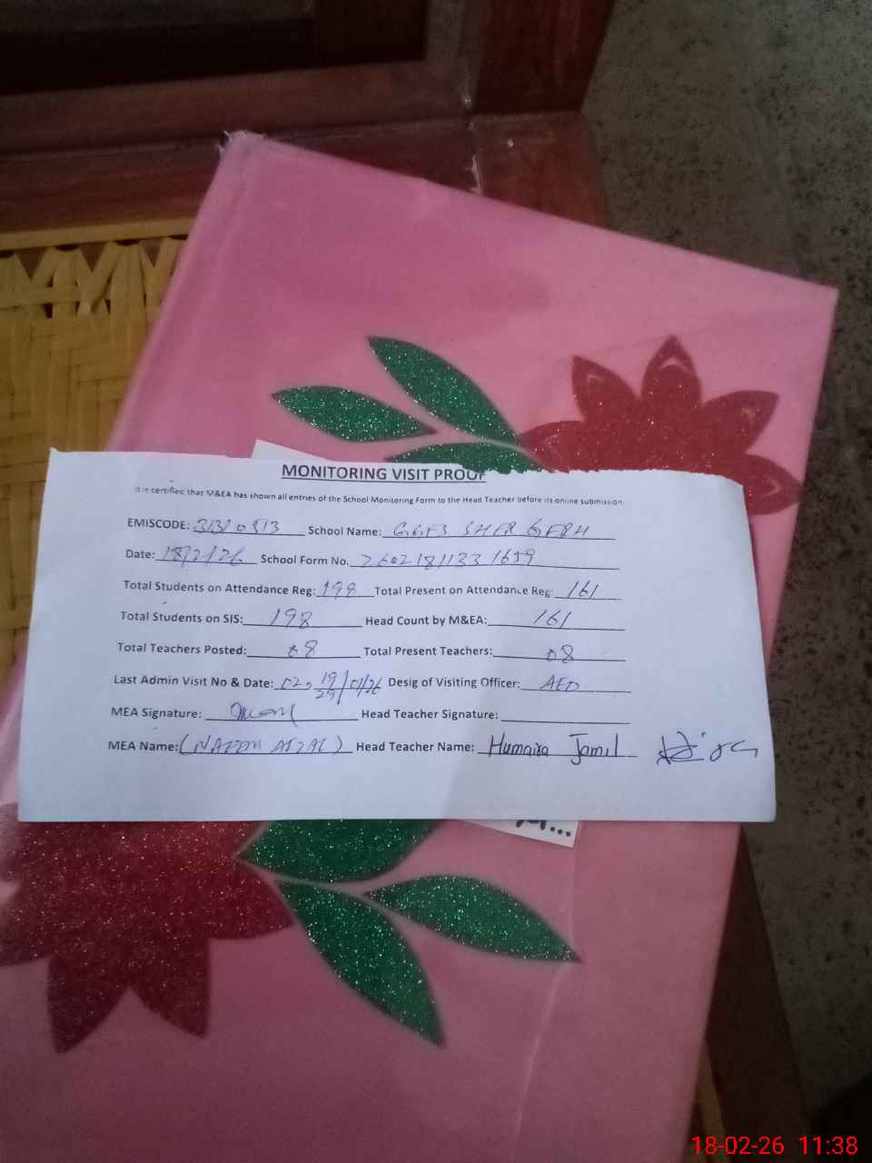 | Attendance Register | Head Teacher | MEA with School | Visit Proof |