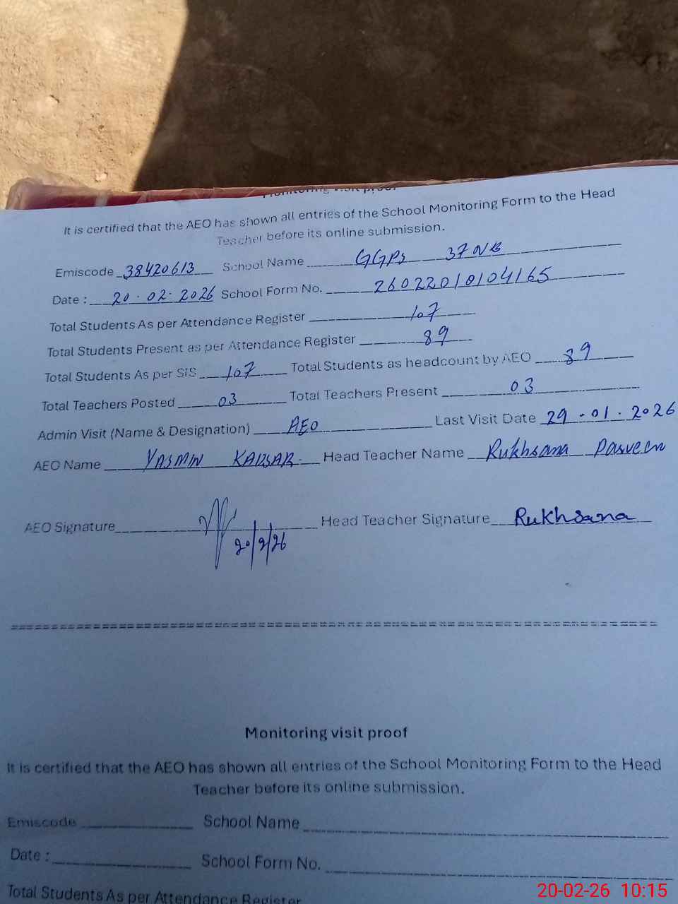 | Monitoring Date: 20-02-2026 | Start Time: 20-02-2026 09:44 AM | End Time: 20-02-2026 10:15 AM | Name of MEA: YA**** KO**** | |