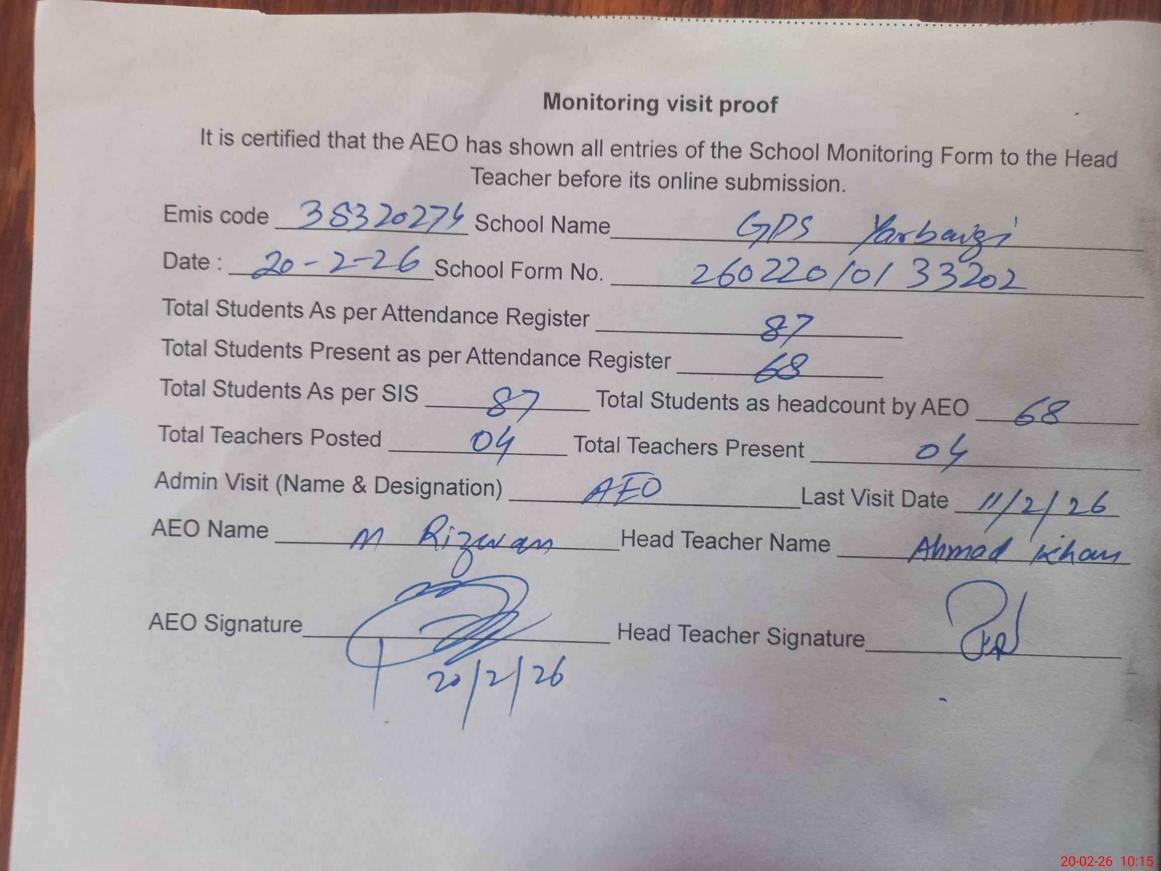 | Attendance Register | Head Teacher | MEA with School | Visit Proof |