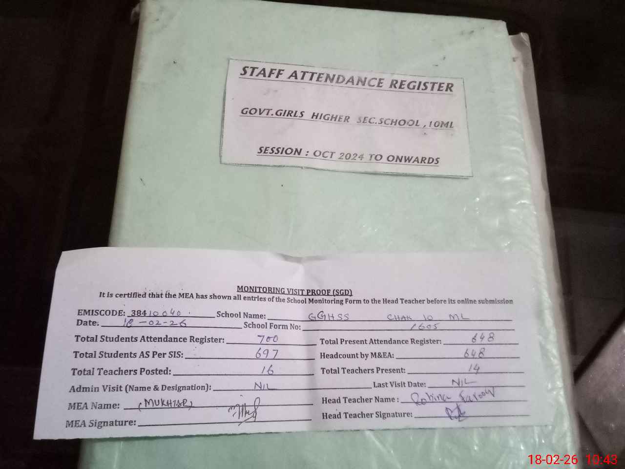 | Attendance Register | Head Teacher | MEA with School | Visit Proof |