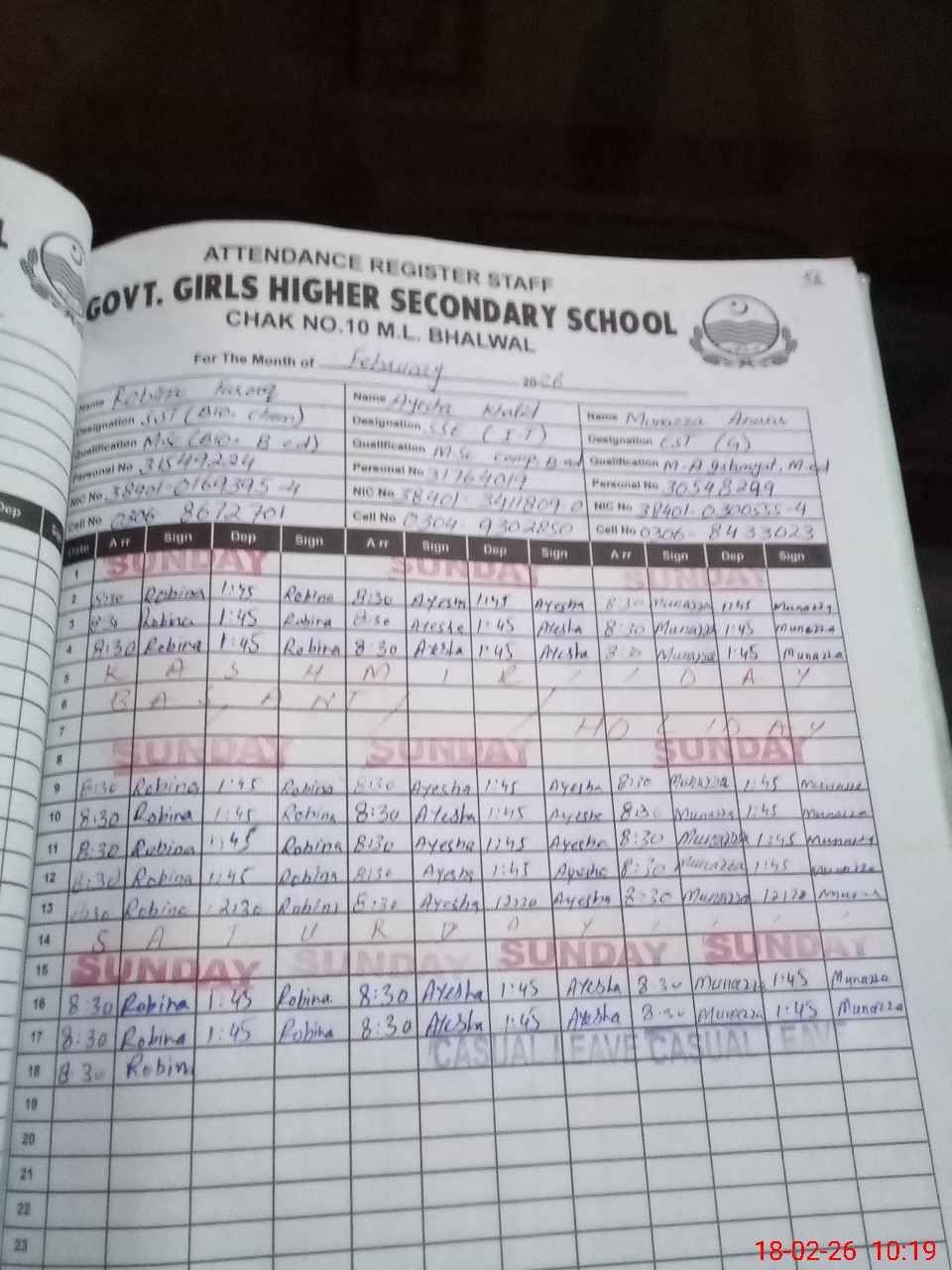 | CNIC | Full Name | Designation | R/C | Absence During Last Calender Month |